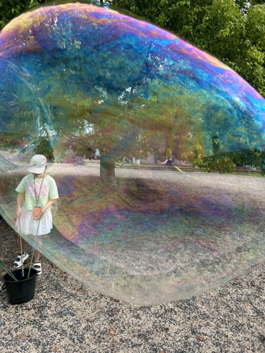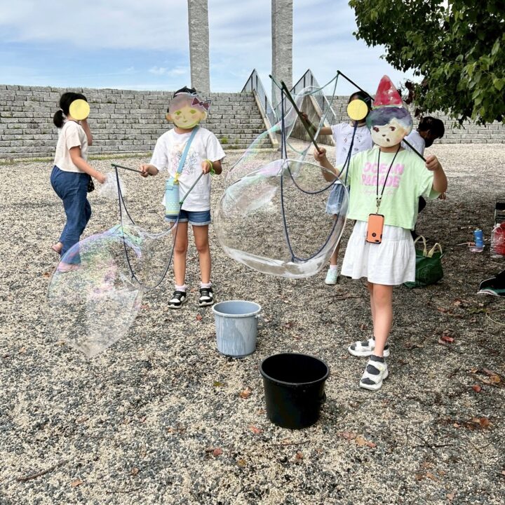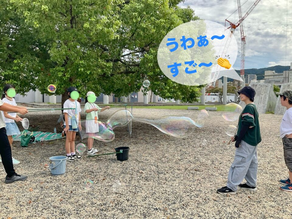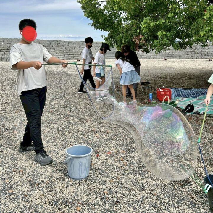 スタッフ特製の道具とスペシャルなシャボン玉液を使って、そ〜っと持ち上げると…びっくりするほど大きなシャボン玉がふわり✨