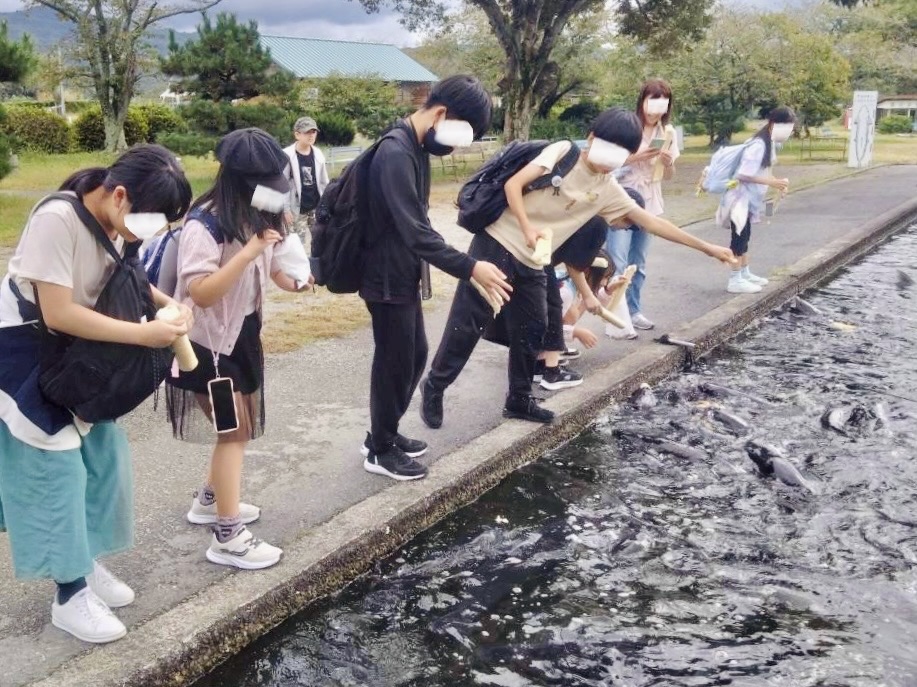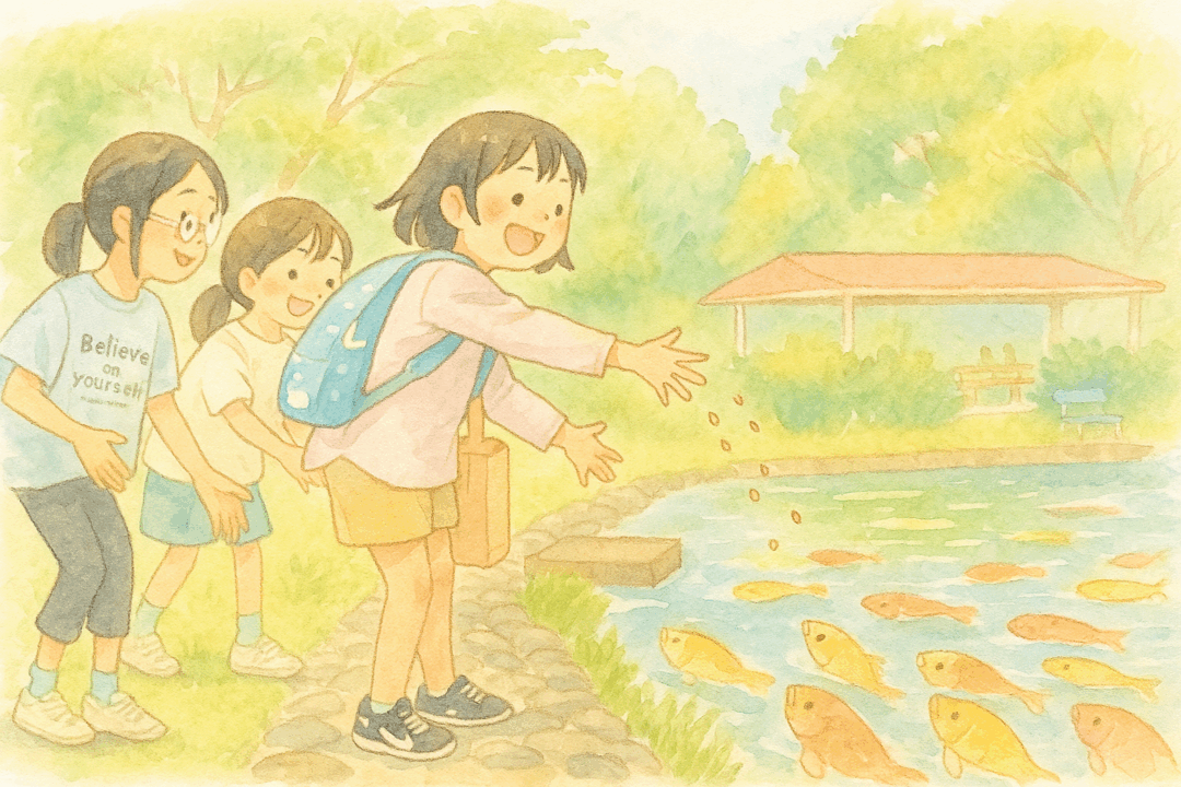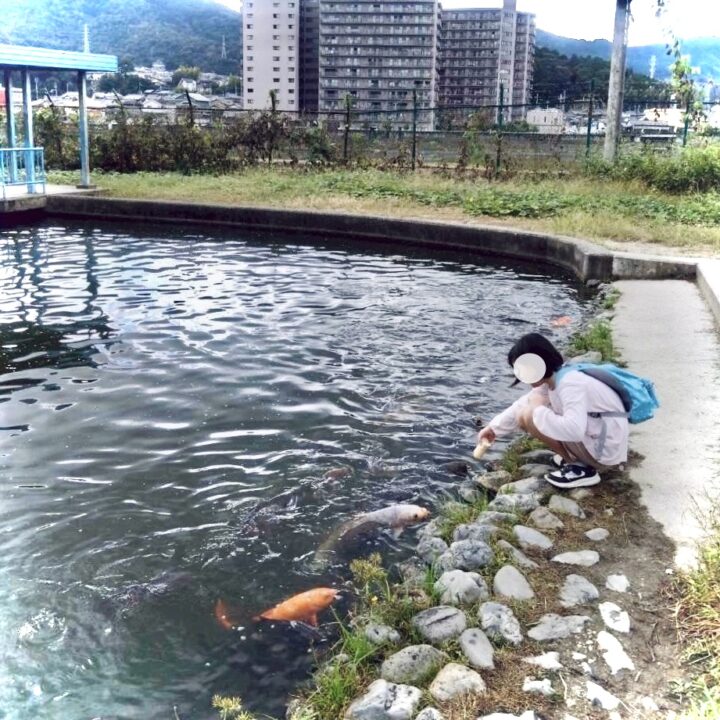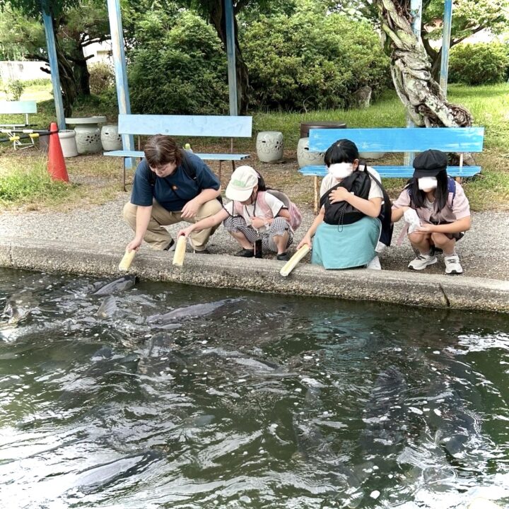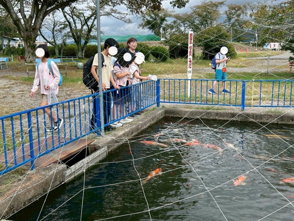 センターに到着すると、みんなで鯉のえさや棒麩を購入して池のほとりへ。