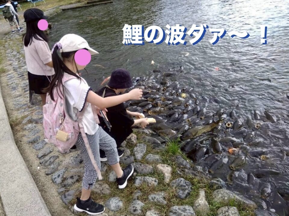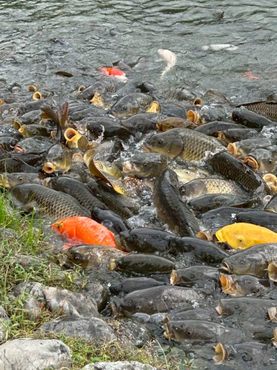 えさを投げ入れると、勢いよく集まってくる鯉たち!