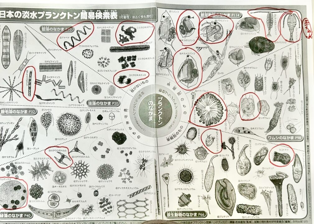 ミジンコ、ケイソウ、ボルボックス、ワムシ、アナベナなど、