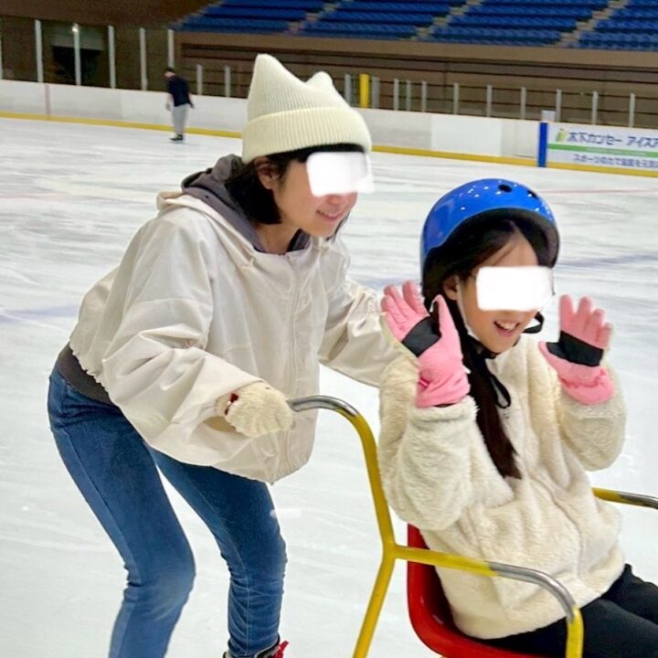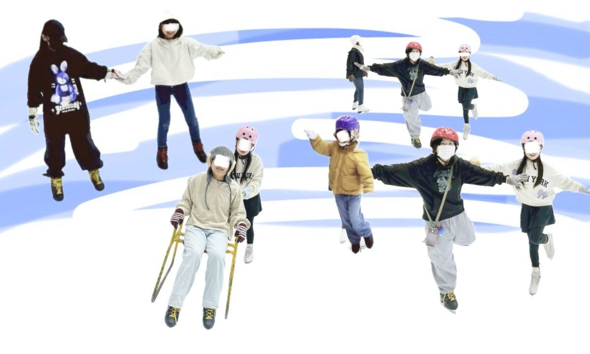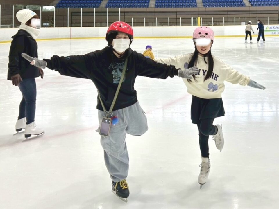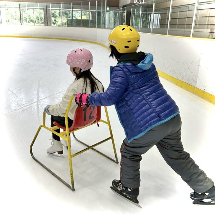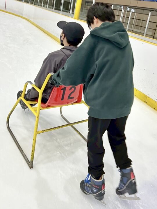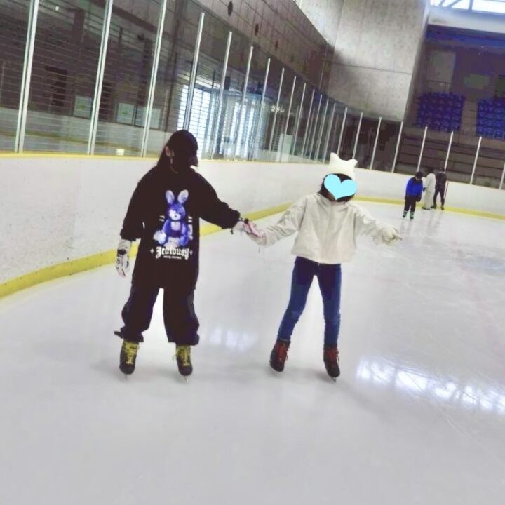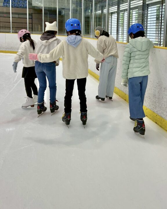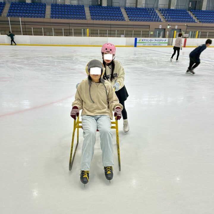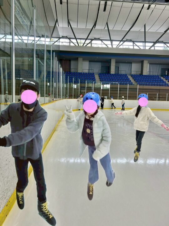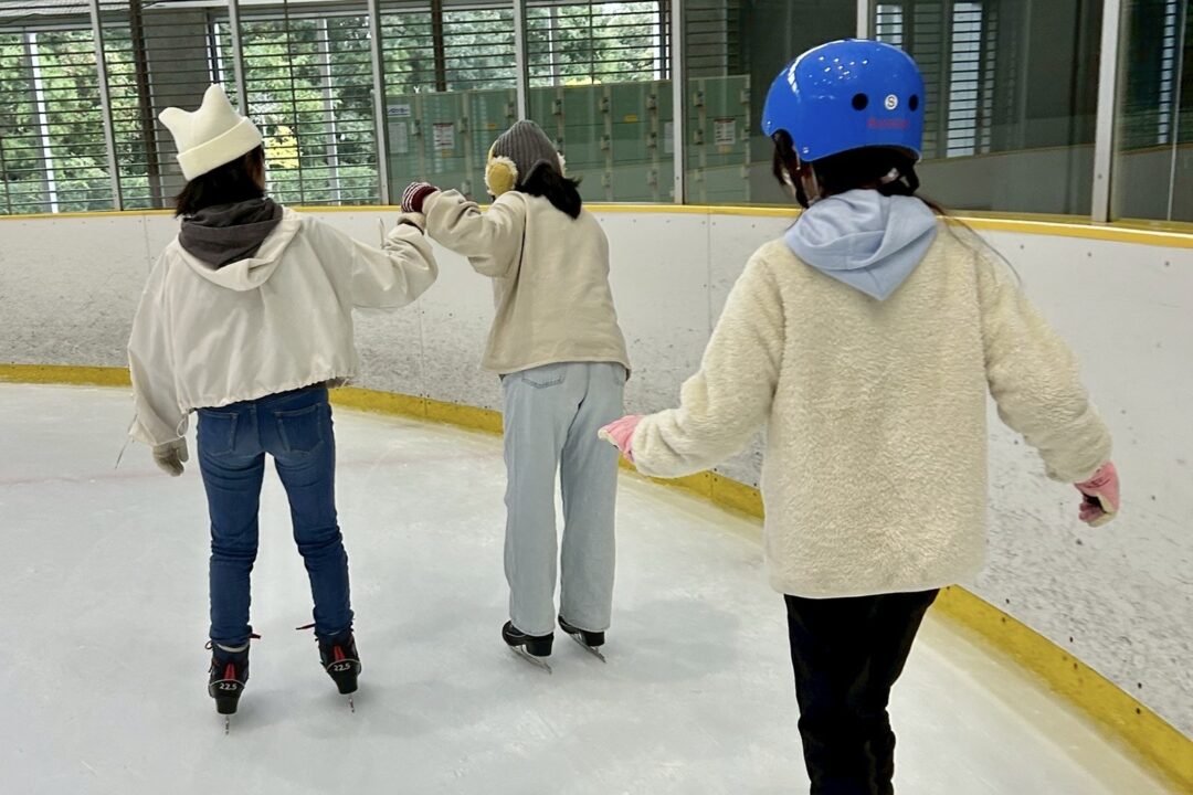 スケート経験がある2人の子が、初めての子の手を取りながら一緒に滑ってくれました。