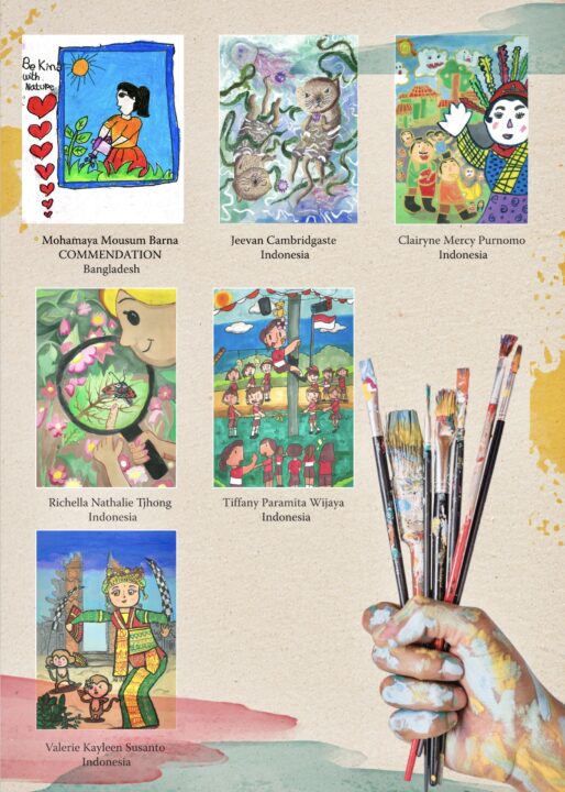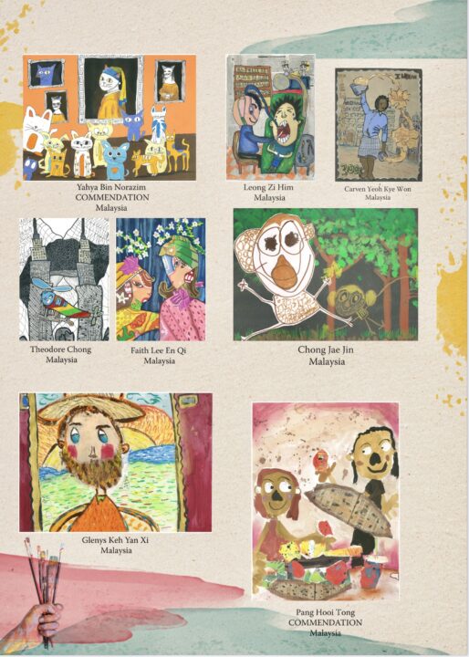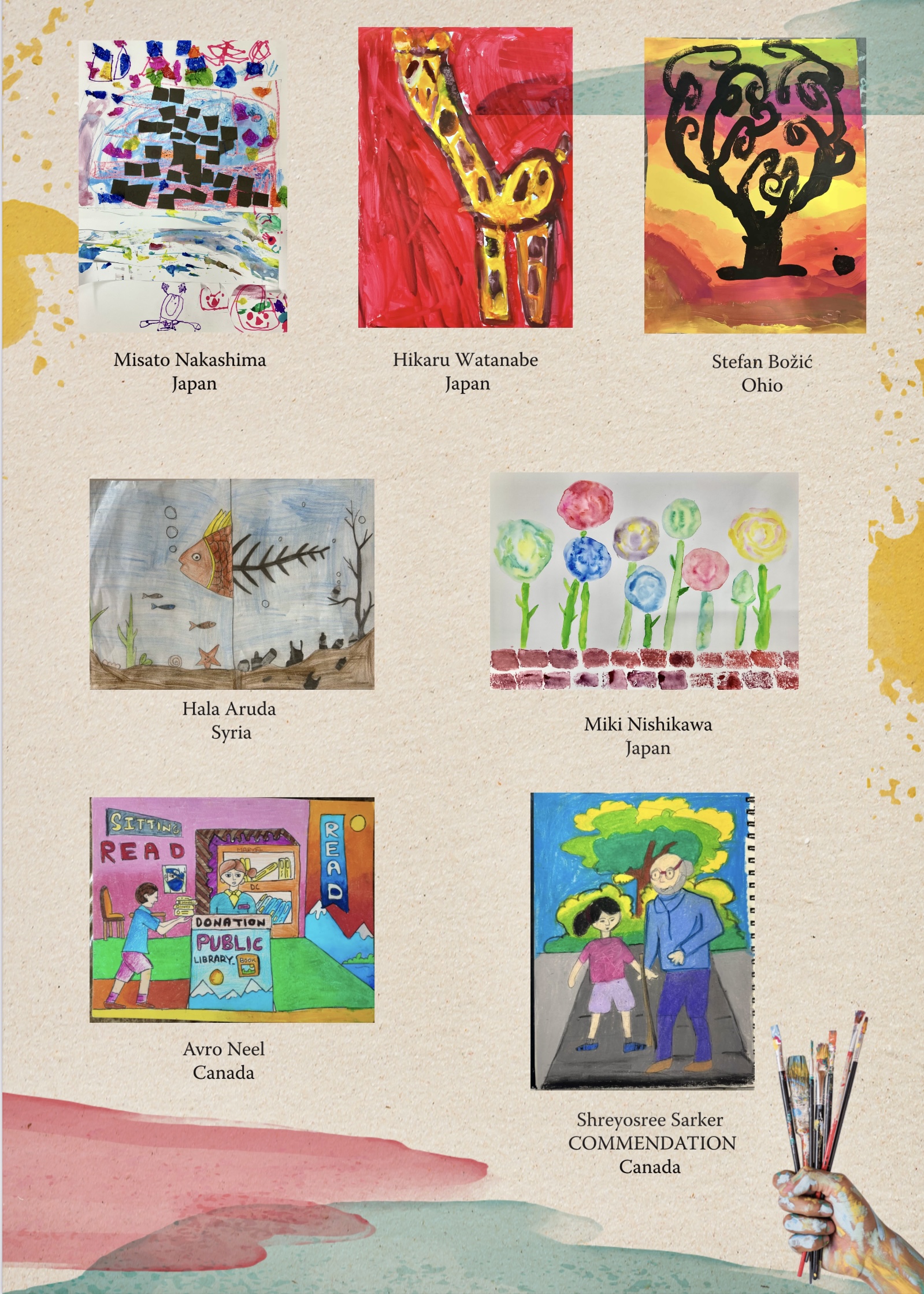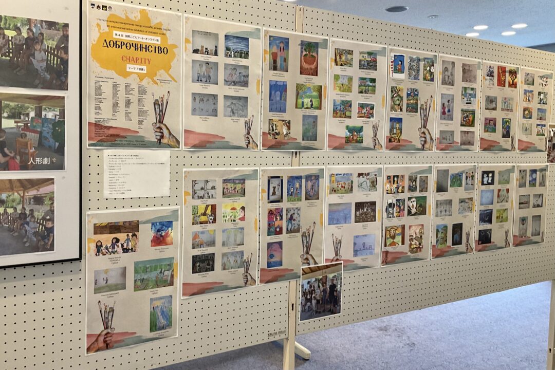展示では、国際こどもオンライン・アート・コンテストの入選作品をポスター形式でずらりと展示。