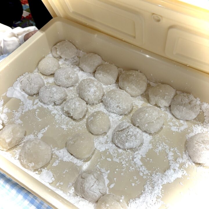 つきあがったお餅は、室内に移動して、熱々のうちにコロコロ丸めます。