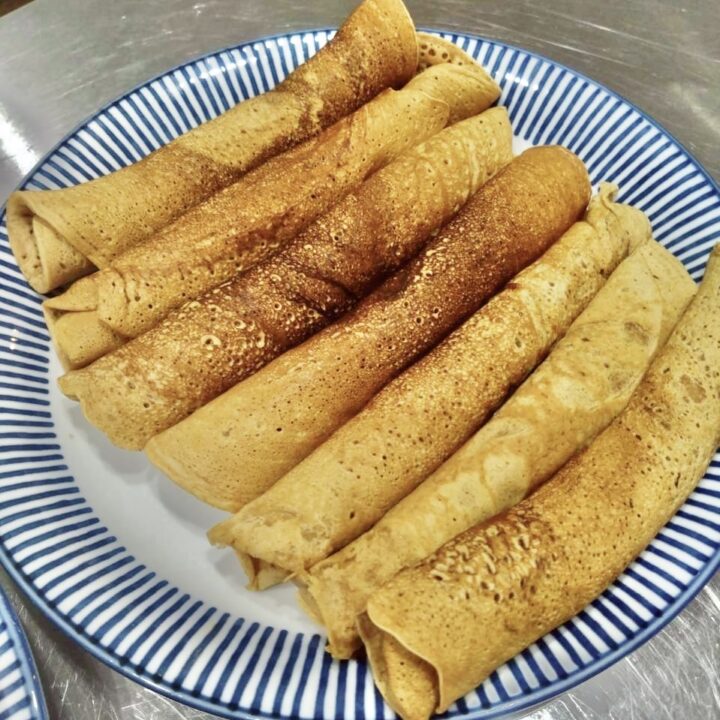 ホットケーキよりも薄く焼き、くるくると巻いてロール状にします。